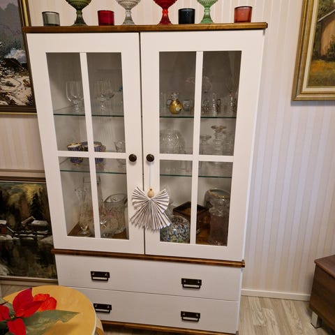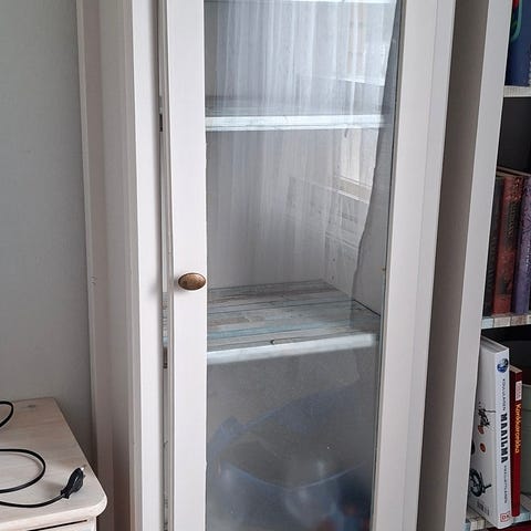 Korkeus 172 cm, leveys 31 cm, syvyys 32 cm. Takalevyssä peili. Ostettu aikoinaan Kodin1:stä