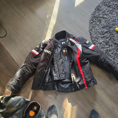 Richa ajotakki, väri musta. Takissa on useita heijastavia yksityiskohtia hihoissa, edessä ja selkäpuolella näkyvyyden parantamiseksi. Edessä vetoketjukiinnitys ja sivuilla taskut. Hihansuissa ja vyötäröllä on säätömahdollisuuksia istuvuuden muokkaamiseen. Selkäpuolella ja olkapäissä on paneeleita, jotka on suunniteltu moottoripyöräilyyn soveltuvaa suojaa ja mukavuutta varten. Koko XL