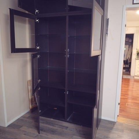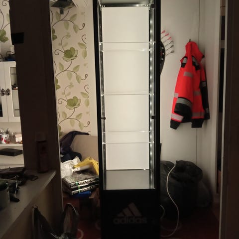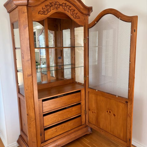 Valkovahattu puinen vitriini. Merkki ei tiedossa, mutta ostettu suomalaisesta kalustekaupasta n. 20 vuotta sitten. Suomalaista puuta. Puuhyllyt