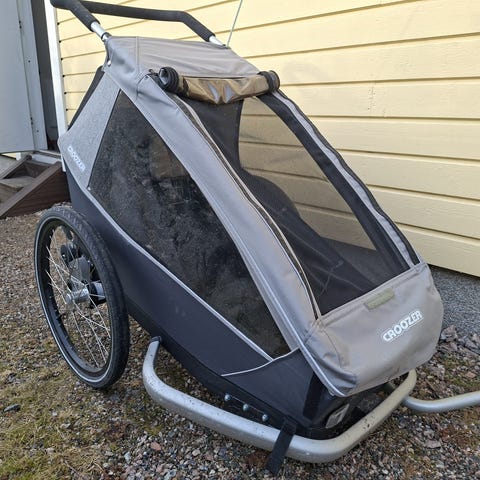 Kahden lapsen Croozer polkupyörän peräkärry. Ikää noin 10 vuotta, vedettyjä kilometrejä max 500km. Mukaan vetovarustus polkupyörälle, isompi eturengas reippailuun, pienempi eturengas asiointireissuille, lippu. Vakaa kärry vetää vähän reippaampaakin vauhtia ja etenkin sähköpyörän perään hyvä kampe! Taittuu kasaan varastointia varten. Putsaillaan ennen luovutusta joten valmis tien päälle vaikka heti.