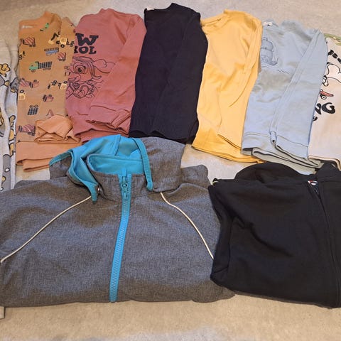 Poikien vaatepaketti, koko 110/116. Kirjava kokonaisuus, jossa useita eri yläosia ja alaosia. Vaatteissa erilaisia värejä ja kuoseja. Sopii noin 110/116 cm pitkälle pojalle arki- ja vapaa-ajan käyttöön.