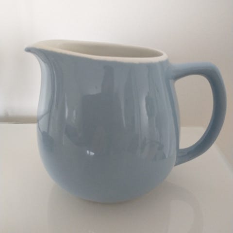 Arabia kaadin keramiikka valkoinen koristekuvio. Kuvassa kaksi vaaleaa, paksusta keramiikasta valmistettua kaadinta, joissa on ruskea reunus ja hillitty koristelukuvio kyljessä. Sopii esimerkiksi veden, maidon tai mehujen tarjoiluun sekä sisustuselementiksi keittiöön tai ruokailutilaan. 2 kpl