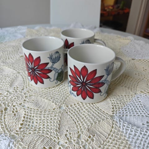 Hieman käytönjälkiä, kahdessa lautasessa särö reunassa (kuvat molemmista).