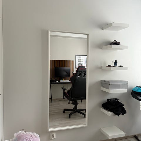 IKEA seinäpeili, suorakulmainen malli. Peilissä on valkoinen kehys ja se on tarkoitettu seinälle kiinnitettäväksi tai ns. seinää vasten nojaavaksi.