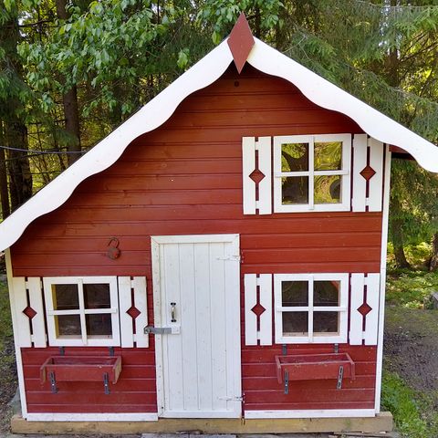 Tehdasvalmisteinen kevythirsi rakenteinen leikkimökki. Hyvä kuntoinen. Kaiteet ja puutarhapenkki kuuluu hintaan. Sisämitat 1,2m x 1,2m x 1,7m. Sivussa avattava ikkunaluukku. Myynnissä myös muualla.