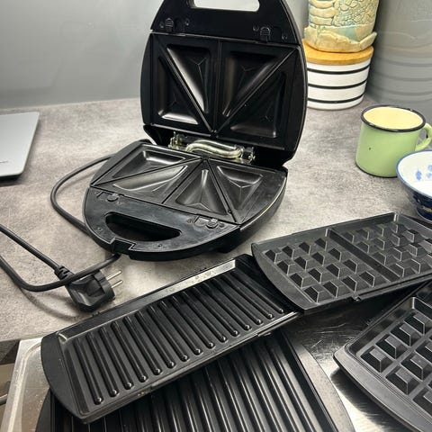 OBH Nordica voileipägrilli, jossa vaihdettavat paistolevyt. Laitteessa on kolmioleipälevyt sekä erilliset levyt, joilla voi valmistaa esimerkiksi vohveleita ja grillata. Yläosassa on merkkivalot laitteen toiminnan seurantaan. Soveltuu lämpimien voileipien ja muiden pienten välipalojen valmistukseen kotikäytössä.