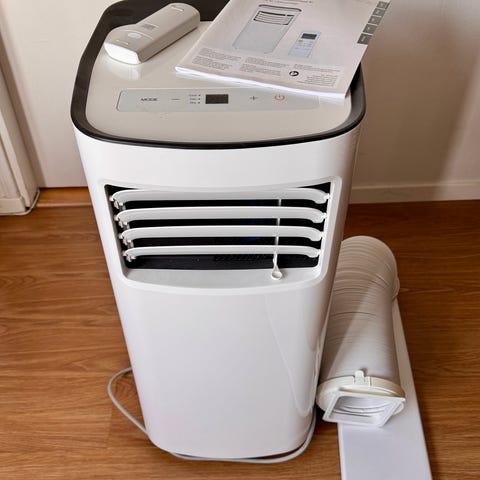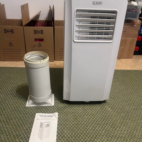 Electrolux EXP35U538CW siirrettävä ilmastointilaite. Takana ilmanpoistoaukko ja liitännät poistoputkelle. Mukana putket ja kaukosäädin.
