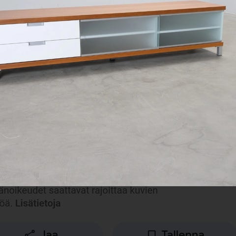 Valkoinen tv-taso, jossa on kolme lasiovea. Kaapin sisällä on lasihyllyt, jotka soveltuvat esim. koriste-esineiden säilytykseen. Hankittu Maskusta noin kaksi vuotta sitten. Nouto Porvoosta.