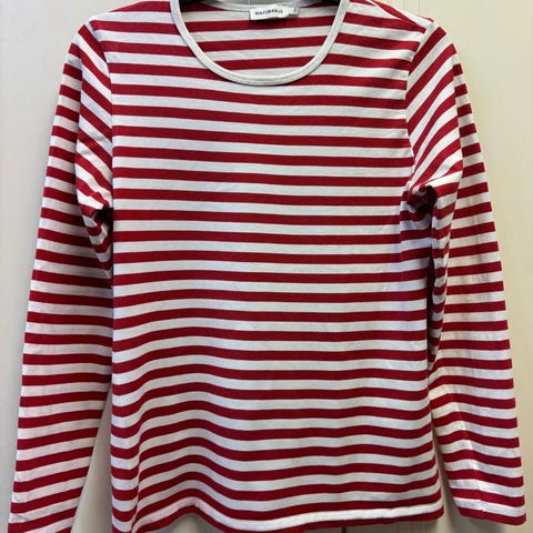 Marimekko naisten paita koossa XS. Pitkähihainen malli, jossa vaakasuora punavalkoinen raitakuvio. Materiaali on puuvillaa. Siistikuntoinen.