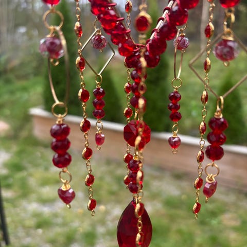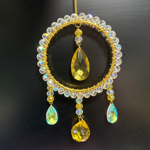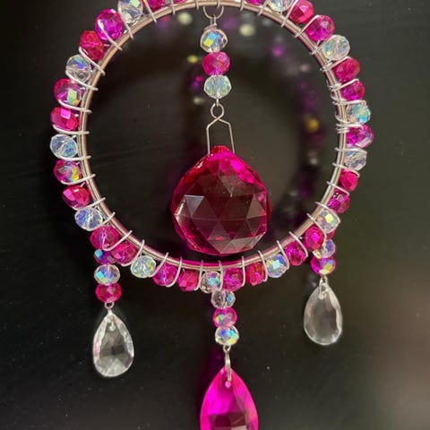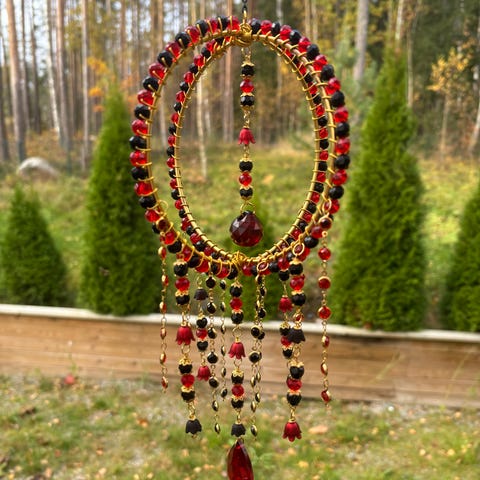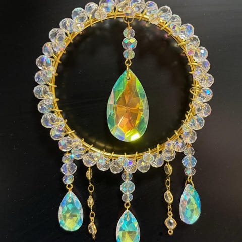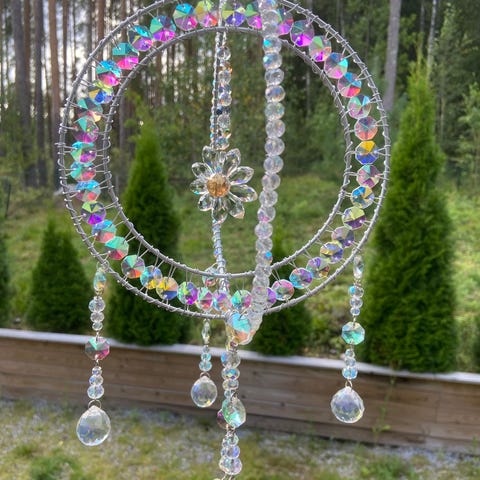 Kaunis pieni auringonsieppari vaikka ikkunaan. Kokonaispituus noin 13cm ja leveys 10cm + ketju ja koukku.