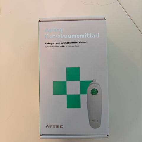 Uudenveroisessa kunnossa oleva AEG:n korvakuumemittari. Paristo puuttuu, mutta toimivuus näkyy viimeisessä kuvassa. Käyttöohjeet saa mukaan.