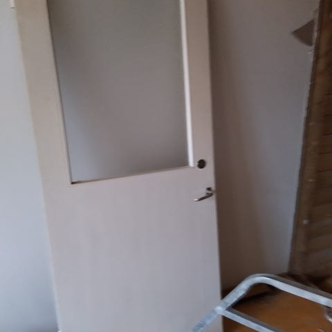 Valkoinen puinen lasiovi, jossa kuusi lasiruutua yläosassa ja umpinainen alaosa. 9×21.