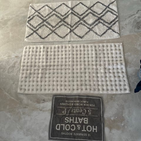 Kaksi kylpyhuoneen mattoa. Käyttämättömät. Tilattu netraudasta, mutta väri olikin täysin eri kuin nettisivuilla.