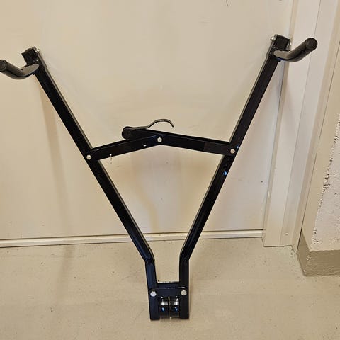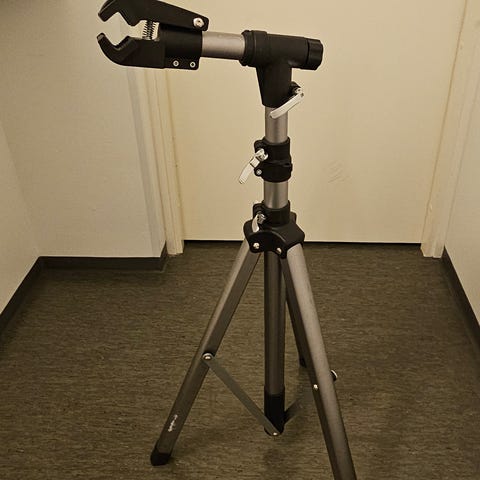 Kuvanmukainen pyöränkorjausteline, hyvässä kunnossa.