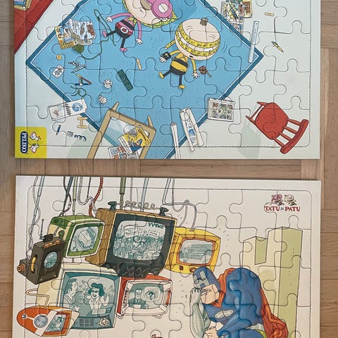 Tomtebobarnen puukuutiopalapeli, jossa on 12 puukuutiota. Kuutioista voi koota kuusi erilaista Tomtebobarnen-aiheista kuvaa. Yhden kuution koko on noin 3,8 x 3,8 x 3,8 cm. Koottuna palapelin mitat ovat noin 15 x 11 x 4 cm. Valmistettu puusta ja tarkoitettu lasten leikkeihin ja hahmotteluun.