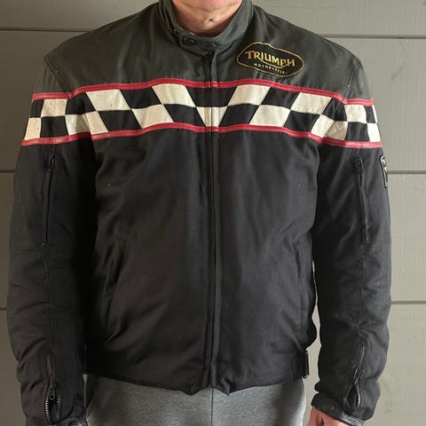 Triumph Motorcycles ajotakki moottoripyöräkäyttöön. Koko XL. Väri musta harmailla paneeleilla. Takin materiaalina pääosin polyesteri, sisäpuolella tikattu vuori ja verkkovuoria hengittävyyden parantamiseksi. Edessä vetoketju ja neppilista, useita taskuja sekä säätöremmit vyötäröllä ja hihoissa istuvuuden säätöön. Selässä ja olkapäissä vahvistetut alueet. Soveltuu moottoripyöräilyyn ja muuhun ajovarustekäyttöön.