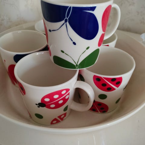 Arabia muki, jossa punavalkoinen kuvitus ja pilkkukuosi alaosassa. Muki on keraaminen ja siinä on painettu kuvitus hahmosta. Pohjassa merkintä Arabia Finland sekä suunnittelijan nimi. Soveltuu juomamukiksi arkeen tai kattaukseen.