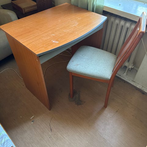 Annetaan Iskun työpöytä. Kulumia löytyy, mutta edelleen täysin käyttökelpoinen. Lipaston voi asettaa kahdella eri tavalla. Kaksi osaa (pöytälevy + lipasto)