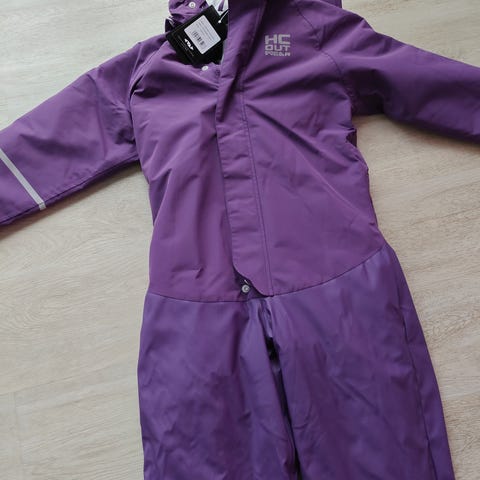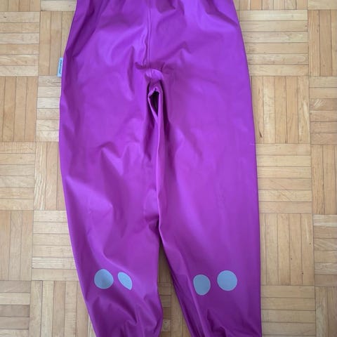 Fleesevuorillinen kurahaalari 134cm. Saumat ehjät. Heijastinnauhat kuluneet, polvessa 1cm paikkaus, jalkalenksut puuttuu. Nimilapussa tarranjämää.