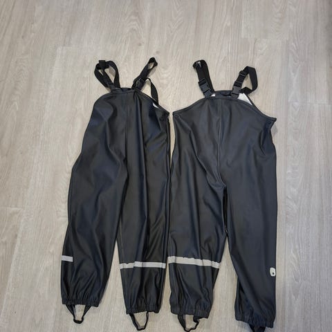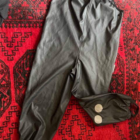 Citat kurahousut koko 110. Käytön jälkeä päällä ja vuorikankaassa. Pepun sauman vedenpitävyys testattu hanatestillä, ja sauma piti edelleen vettä.