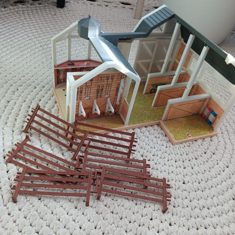Hyväkuntoinen koottava hevostalli leikkeihin. Sisältää kolme hevosta, joissa kaulamekanismi (kts kuva).
