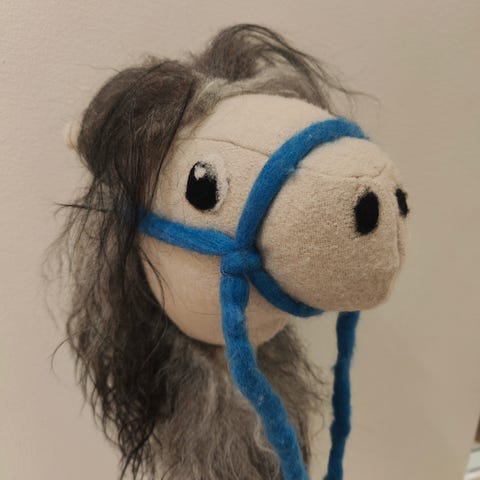 Almanhepat tekemä keppihevonen/lehmä. Päässä vähän likaa, näkyy kuvassa. Pää ei heilu ja pysyy hyvin kiinni. Riimu tulee mukana.