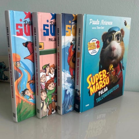 Paula Norosen Supermarsu ja vieraat viemäristä -lastenkirja. Kovakantinen kirja, jossa on mustavalkoista tekstiä ja värikuvitusta. Kirja kertoo Supermarsu-Emiliasta ja hänen seikkailuistaan. Sopii alakouluikäisille lukijoille tai ääneen luettavaksi. Kirja on suomenkielinen.
