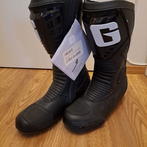 Sidi ajosaappaat mustaa nahkaa, varressa ja jalkapöydän kohdalla on vahvikkeita ja muotoiltuja suojapaneeleita. Pohjassa on karkea kuviointi, joka tarjoaa pitoa polkimilla ja maassa. Varressa on tarrakiinnitys ja vetoketju helpottamassa pukemista. Vuorinahka vetoketjun alta taitteesta on kulunut ja mureneva, en ole itse jaksanut sitä korjata, mutta varmaan lankkaamalla ja harjaamalla saisi parempaan kuntoon.