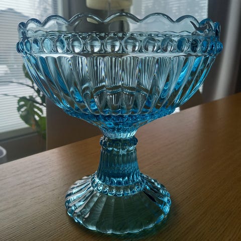 Iittala Mariskooli jalallinen lasikulho sinistä lasia. Kulhossa on koristeellinen, uurrettu pinta ja aaltomainen reuna. Sopii esimerkiksi tarjoiluun tai sisustuselementiksi. Jalallinen malli tuo korkeutta kattaukseen. Mieluiten nouto.