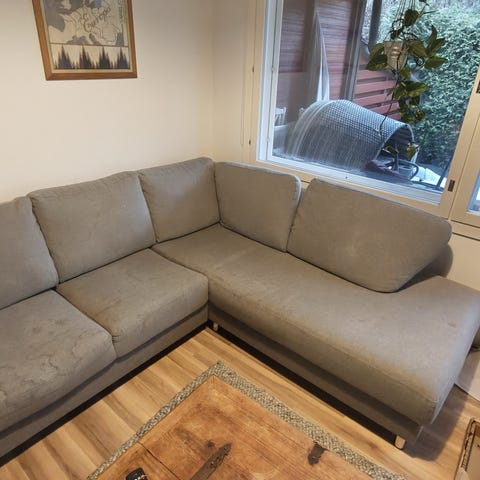 Annetaan harmaa kangaspäällysteinen sohva. Muutamia kuvissa näkyviä jälkiä jotka varmaan saa oikeilla aineilla puhdistettua.