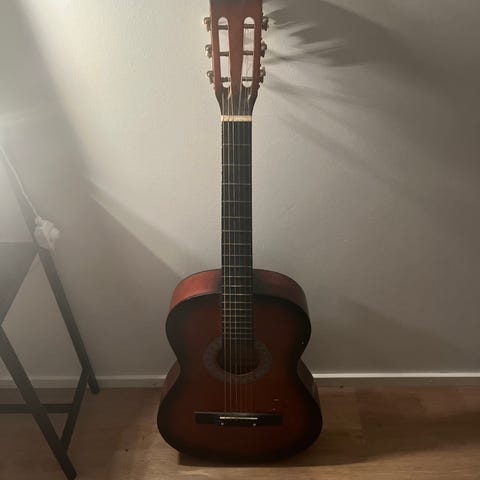 Kitara on oikein hyväkuntoinen, pieni jälki kyljessä (kuva). Kielet vaihdettu melko vastikää opettajan toimesta. Kitaralaukun kädensijasta pehmuste karannut (kuva), muutoin laukku ok.