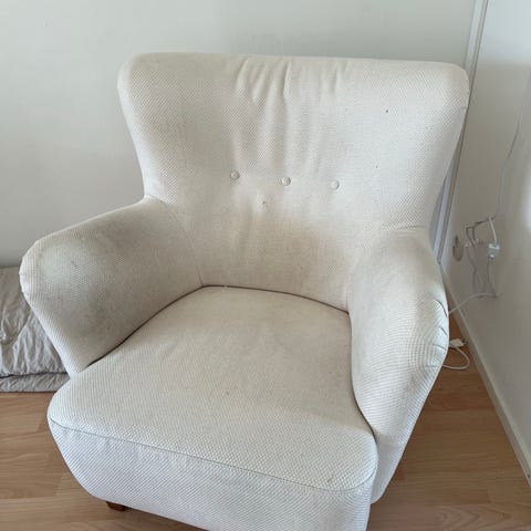 Ihan ok kunnossa nojatuoli. Sininen. Käsinojissa kulumaa. Muuten ok.