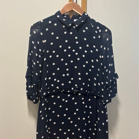 Ganni gingham-mekko, koko 36. Monivärinen ruutukuosinen mekko, jossa röyhelöyksityiskohtia pääntiellä ja olkapäillä. Valmistettu pääosin puuvillasta (materiaalilapun mukaan 55 % puuvillaa, loput polyesteriä ja polyamidia). Lyhyt malli, olen 178 cm