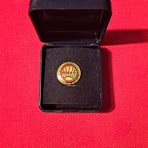 Suomen Kirkkomusiikkiliitto ry:n (SKML) ansiomerkki, virsimerkki. Vanhempaa mallia, jossa on lukkoneulakiinnitys, pronssia.