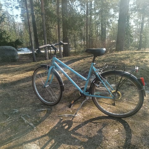 Kolmipyörä työntöaisalla. Ollut käytössä 1-3vuotiailla. Elämää nähnyt, mutta vielä ehjä ja toimiva. Nouto hanhijärveltä.
