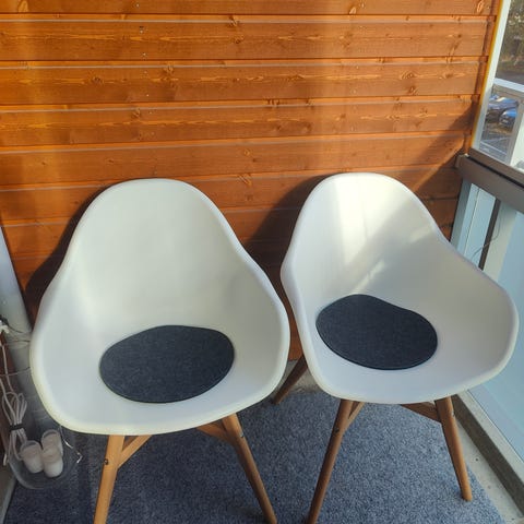 Toisen tuolin kankaassa pieniä tahroja ja toisen tuolin istuimen vaahtomuovi menettänyt kimmoisuuden - pieni upotus istuessa. Muuten hyvän kuntoiset ja siistit.