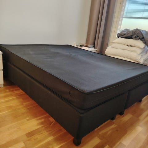 Laadukas ASKO BONNELL parisänky. Sängyssä on korkeat jalat ja kaksiosainen alarunko. Kuvista näkyy sängyn verhoilun rakenne ja väri sekä jalkojen malli. Runkopatja 160x200cm. Petauspatja 5cm. Hp. 400.
