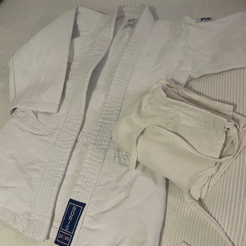 Essimo-merkkinen judopuku, kokomerkintä 140. Pienehkö/pesussa kutistunut koko, sopii suunnilleen vaatekokoa 134 käyttävälle, housujen pituus haarasta lahkeeseen noin 53cm. Pesty hajusteettomasti, koiratalous.