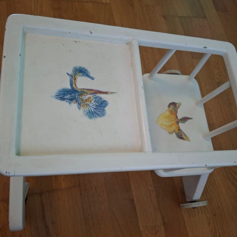 Myydään täyspuinen vanha syöttötuoli. Maalattu tikkurilan huonekalumaalilla flamingon väriseksi. Maalipinta kulunut käytössä, mutta tästä saa tuunaamalla vielä oikein hyvän.