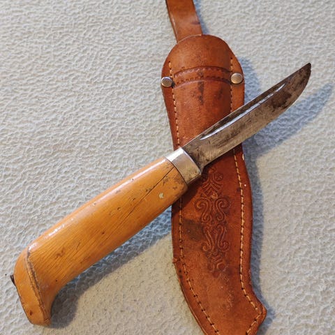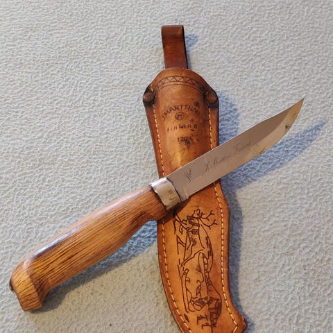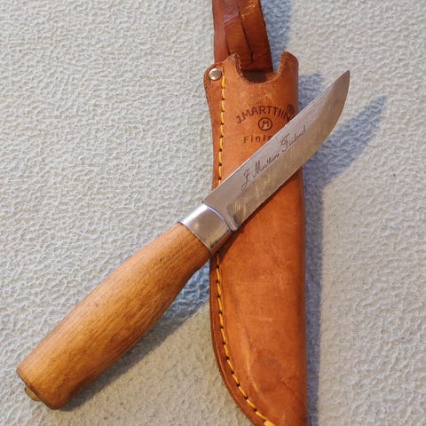 Vanha marttiini, pituus 27,5, terä 15,5cm J. Marttiini finland tekstillä, koivukahva, nahkatuppi tunturiloma logolla