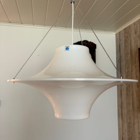 Yki Nummen suunnittelema ikoninen lokki-valaisin. Halkaisija 70cm eli lokki-valaisinmalleista se suurempi.