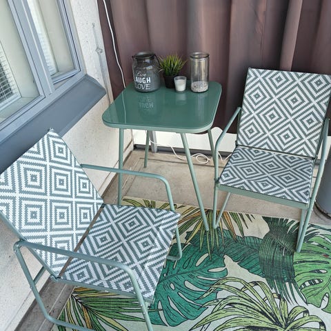 Kaksi mustaa tuolia ja musta pöytä parvekkeelle. Vain nouto.