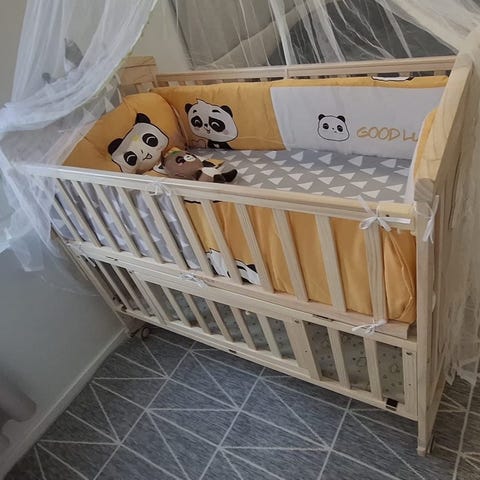 Sänky täyspuuta, melko painava. Pohjan saa säädettyä kahdelle eri tasolle ja laidat halutessaan irti. Hyväkuntoinen, laidoissa on pureskelun estävät muoviset suojukset. Jotain naarmua voi löytyä jos tarkkaan katsoo, mutta yleisilmeeltään sänky on erittäin siistissä kunnossa ja täysin ehjä. Tosi tukeva. Kaikki osat ja kiinnikkeet tulee mukana.