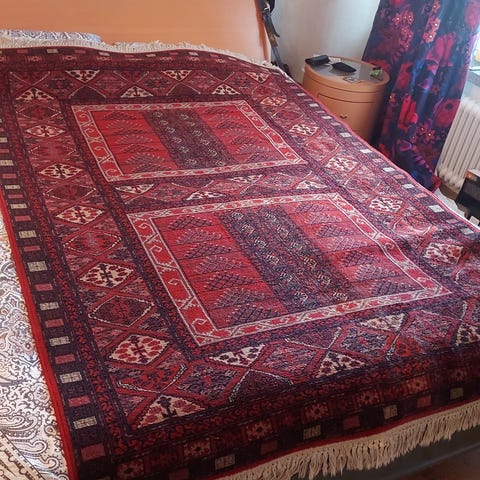 Erittäin hyvin pidetty vaikka 70-luvulla tamperelaisesta mattoliikkeestä hankittu villamatto. Kunto moitteeton. Koko 300x200. Ei eläintalous.
