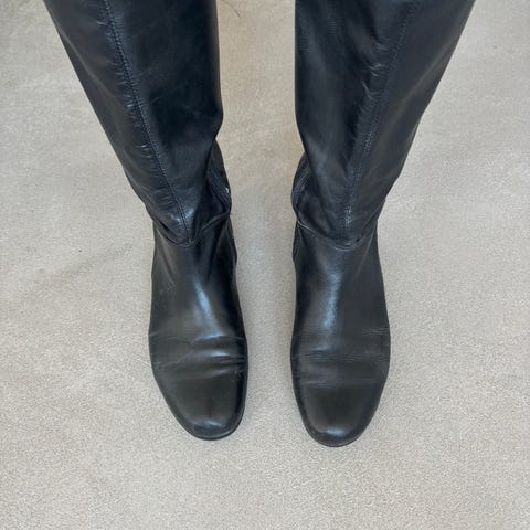 Vagabond saappaat, koko 41. Mustat, polven alle ulottuvat nahkasaappaat matalalla korolla. Varressa vetoketju sisäsivulla ja kantapään ympärillä niittikoristelu.