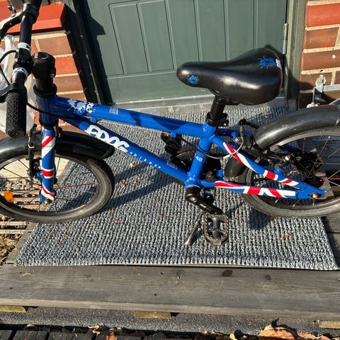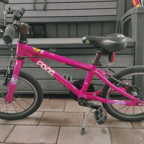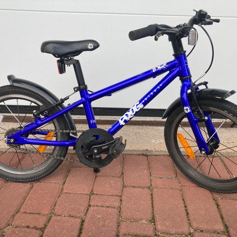 Frogin 16 tuumainen pyörä seuraavalle pyöräilyä harjoittelevalle. Pyörä on ollut kahdella lapsella käytössä ja siten pientä käytön jälkeäkin on. Satulassa on pieni nirhauma ja takalokarista puuttuu joku kiinnike. Lokari pysyy kyllä kiinni ja suojaa, mutta ottaa kiinni renkaaseen. Muutoin kunto on hyvä ja renkaissa kulutuspintaa jäljellä.