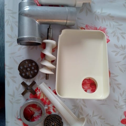 Kenwood keittiön yleiskoneen lisälaite vihannesleikkuri, irrotettavalla syöttöosalla ja useilla terälevyillä. Mukana 4 eri rei’ityksellä ja leikkauskuvioilla varustettuja metallisia terälevyjä, karkea ja hieno raastin sekä ohut ja paksu siivutin. paksun siivuttimen terä teroitettu minun toimestani, muuten tämä lie hyvin vähän käytetty