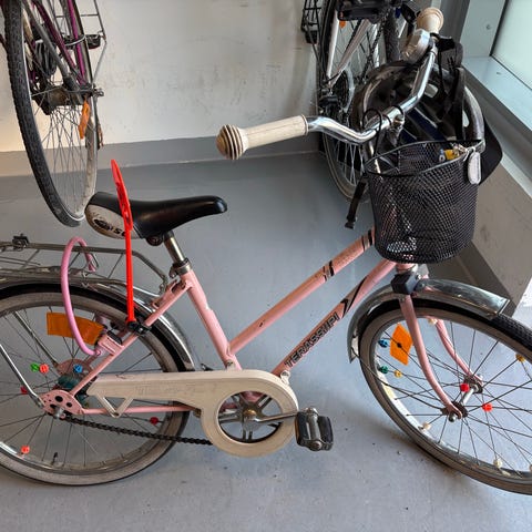 Lasten polkupyörä 20" renkailla. Rungon ja lokasuojien värit ovat valkoinen ja vaaleanpunainen. Pyörässä on matala runko, jalkatuki, tavarateline takana sekä ketjusuoja. Soveltuu noin 6-7 vuotiaalle. Lokasuoja hieman pitä ääntä. Pienellä huollolla varmasti ongelma poistuu.