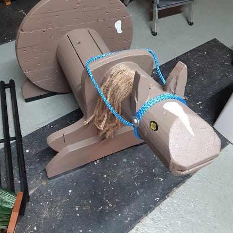 Istuttava leikkihevonen. Istuinkorkeus 75cm. Hyväkuntoinen. Uusi maksaa 150€.