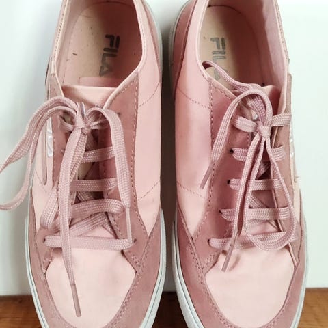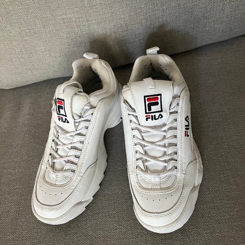 Fila tennarit, koko 40. Väriltään pääosin valkoiset tummansinisillä ja punaisilla yksityiskohdilla sekä Fila-logoraidalla. Nauhakiinnitys ja paksu kumipohja, joka sopii arkeen ja vapaa-aikaan. Kenkien yläosa synteettistä materiaalia ja tekstiiliä, sisäosa pehmustettu käyttömukavuuden lisäämiseksi.